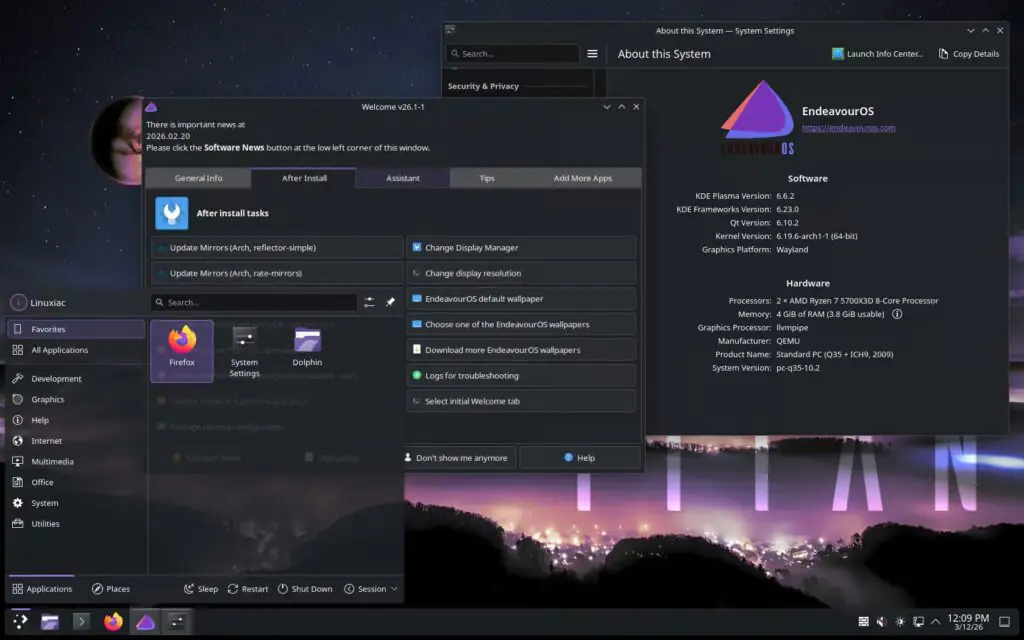EndeavourOS Titan вышел с ядром Linux 6.19 и обновлённым KDE Plasma