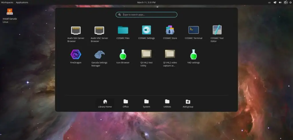 Версия Garuda COSMIC находится в том же состоянии, что и любой другой дистрибутив GNU/Linux, включая сам Arch Linux, в установщике которого на основе меню есть экспериментальная функция, позволяющая развернуть совершенно новую установку с окружением рабочего стола COSMIC.
