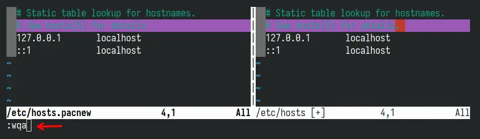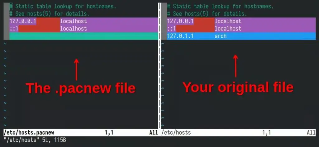 Следующий шаг, конечно же, — просмотр различий. Нажмите «v», затем «Enter», и вы перейдете на следующий vimdiff экран, на котором будет показан первый найденный файл pacdiff — в данном примере /etc/hosts.