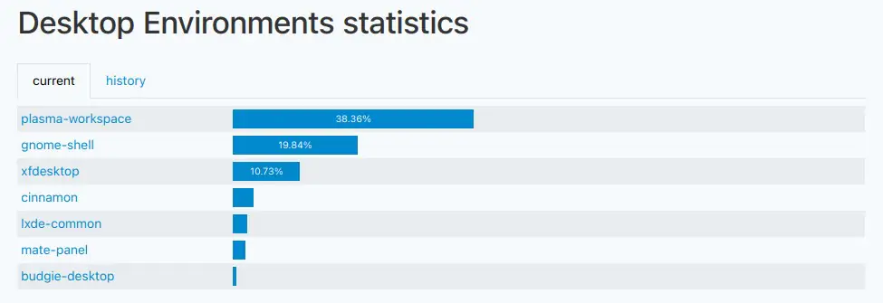 Веб-сайт pkgstats.archlinux.de собирает эти данные и предоставляет сводную статистику об установленных пользователями Arch пакетах. Другими словами, это своего рода коллективный снимок использования пакетов в установках Arch, в которых участвуют пользователи. Конкретные данные по рабочим средам можно найти здесь, а по оконным менеджерам — здесь.