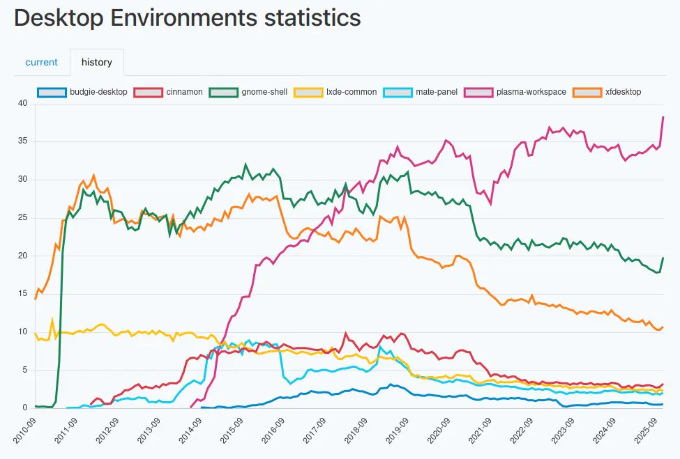 Cinnamon, LXDE, MATE и Budgie занимают меньшую часть диаграммы. Пик популярности Cinnamon пришелся на конец 2010-х годов, но с тех пор наблюдается тенденция к снижению, как и в большинстве десктопов, не использующих GNOME и KDE. Снижение популярности LXDE более заметно, что отражает переход проекта на LXQt. MATE и Budgie демонстрируют небольшое, но стабильное использование, которое практически не изменилось за последние несколько лет.