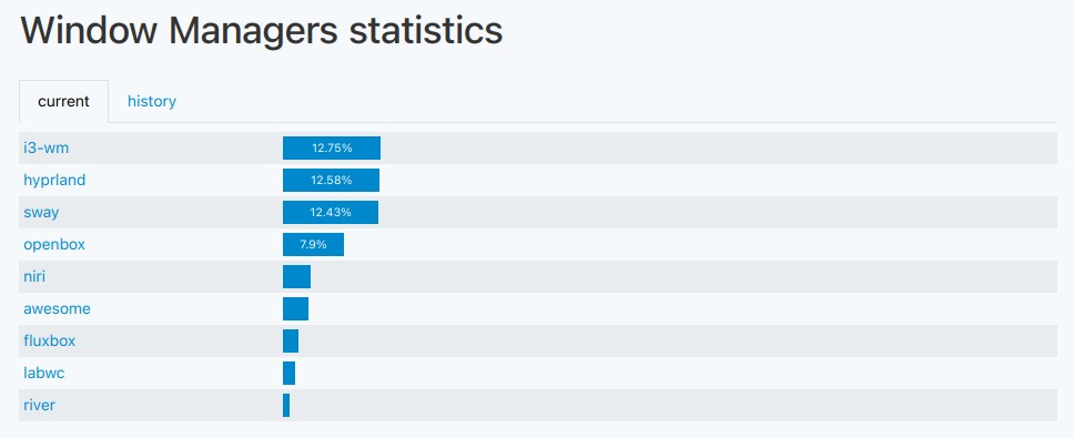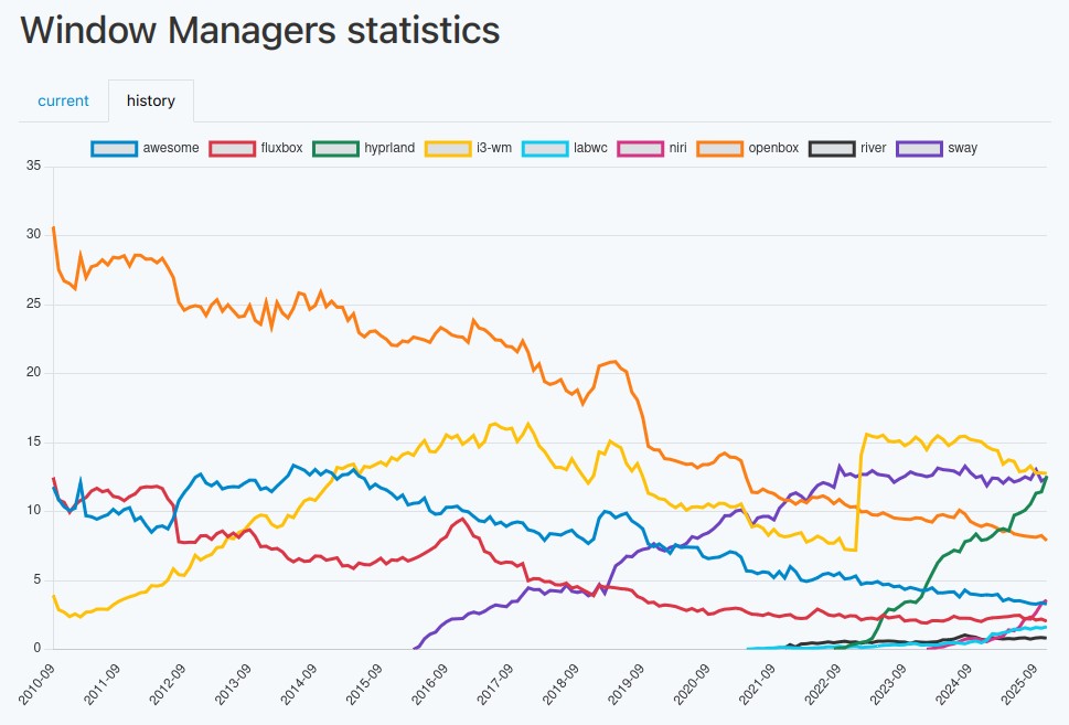По последним данным на декабрь 2025 года, доля i3 составляет 12,75 %, Hyprland — 12,58 %, а Sway — 12,43 %. По статистике, эти три программы практически равны, и вместе они составляют более трети всех зарегистрированных установок оконных менеджеров. Однако каждая из них достигла этого положения благодаря совершенно разным историческим траекториям.