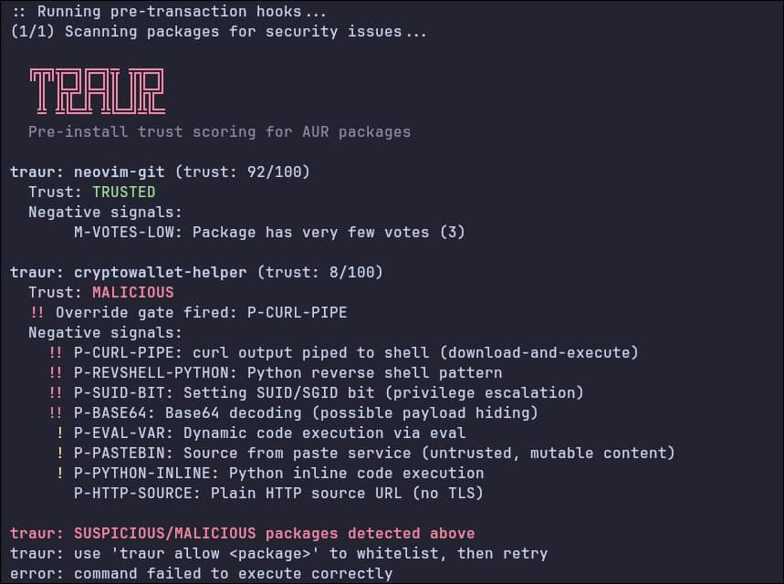 Кроме того, Traur проверяет PKGBUILD и .install скрипты на наличие опасных команд оболочки, подозрительных хуков, скрытого кода и известных случаев злоупотребления. Он также анализирует URL-адреса источников, использование контрольных сумм, активность сопровождающих, популярность пакетов, необычные названия (например, из-за опечаток) и изменения в истории git, которые могут указывать на риски, например появление нового сетевого кода или внезапная смена авторов.