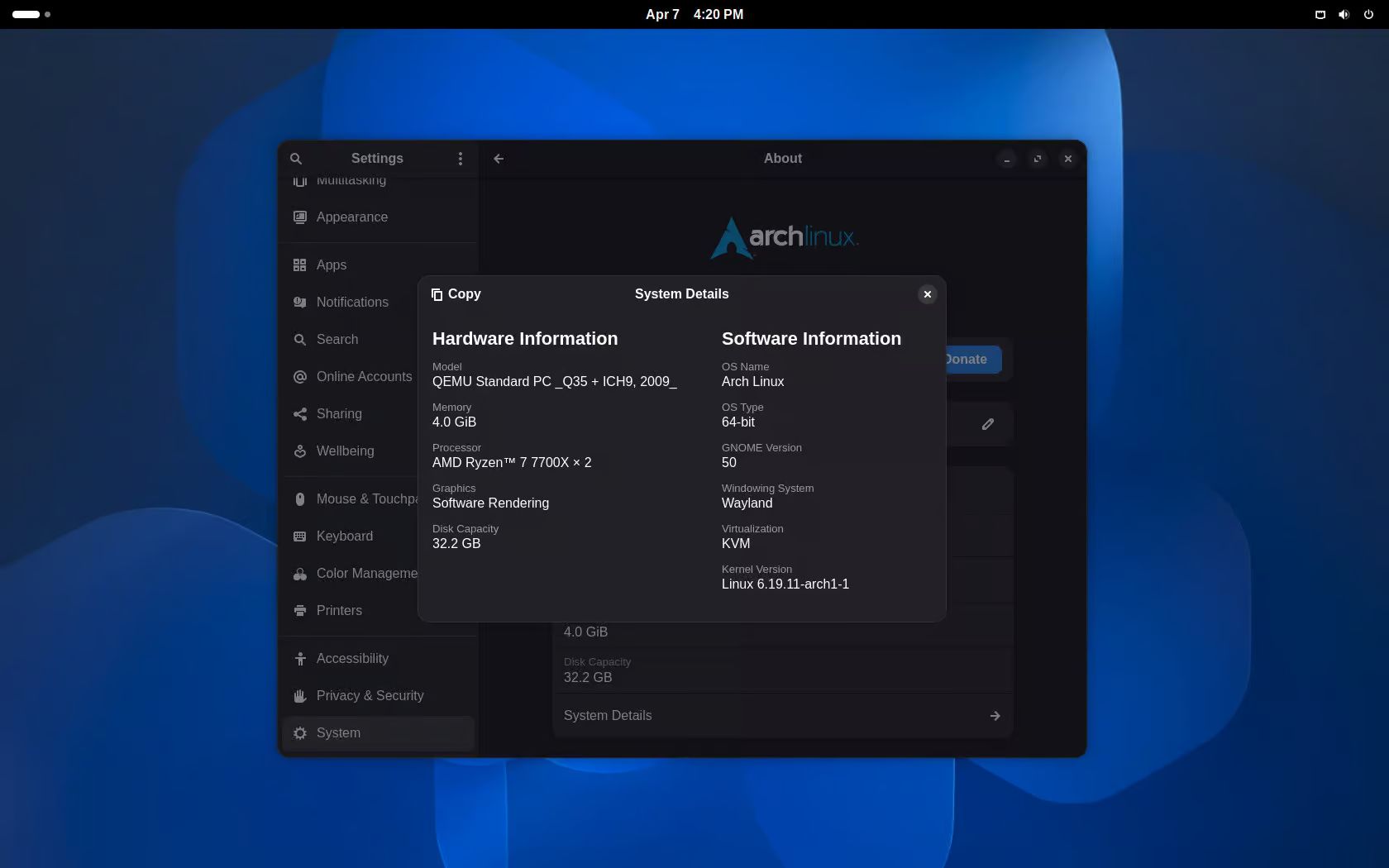 GNOME 50 в Arch Linux.