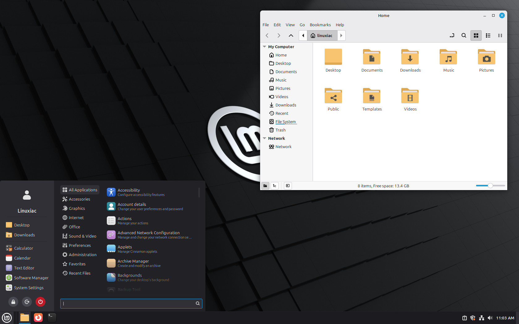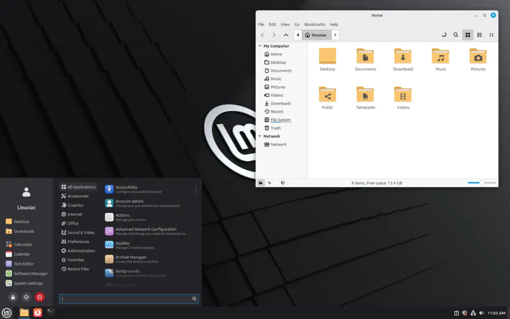 Во-первых, интерфейс рабочего стола сразу кажется знакомым. Рабочий стол Cinnamon в Mint по умолчанию имеет традиционную компоновку с нижней панелью, системным треем и меню в левом нижнем углу. Другими словами, пользователям не придётся заново учиться работать с компьютером.