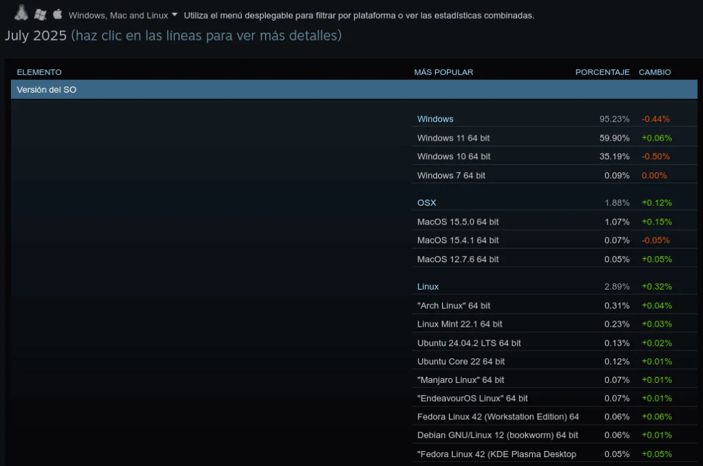 Опрос Steam проведенный в июле 2025 года, выявил некоторые интересные факты, касающиеся Linux, что случается не каждый месяц. На этот раз мы сталкиваемся с Linux, доля которого приближается к трем процентам, и появлением дистрибутива, отсутствие которого вызывало немало вопросов и сомнений в его реальной популярности.