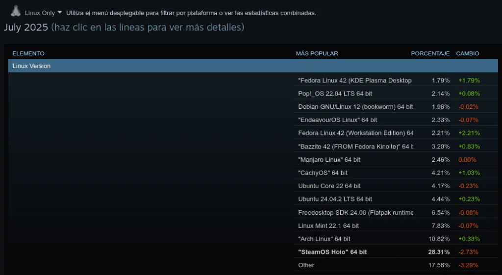 Что касается самых популярных дистрибутивов, список стал длиннее, что позволило появиться Fedora, дистрибутив сообщества, авторские права на который принадлежат Red Hat. На четырнадцатой позиции находится версия Fedora 42 с KDE Plasma, на которую приходится 1,79% всех пользователей Steam для Linux, которые согласились заполнить опрос. Fedora Workstation 42 занимает одиннадцатое место с 2,21%, а Bazzite 42, основанный на Kinoite, находится на восьмом месте с 3,20%. Отсутствие Fedora в предыдущих случаях могло быть связано с тем, что дистрибутив не предустановил пакет, необходимый для правильной идентификации клиентом Steam, поэтому он был обнаружен как обычный Linux.
