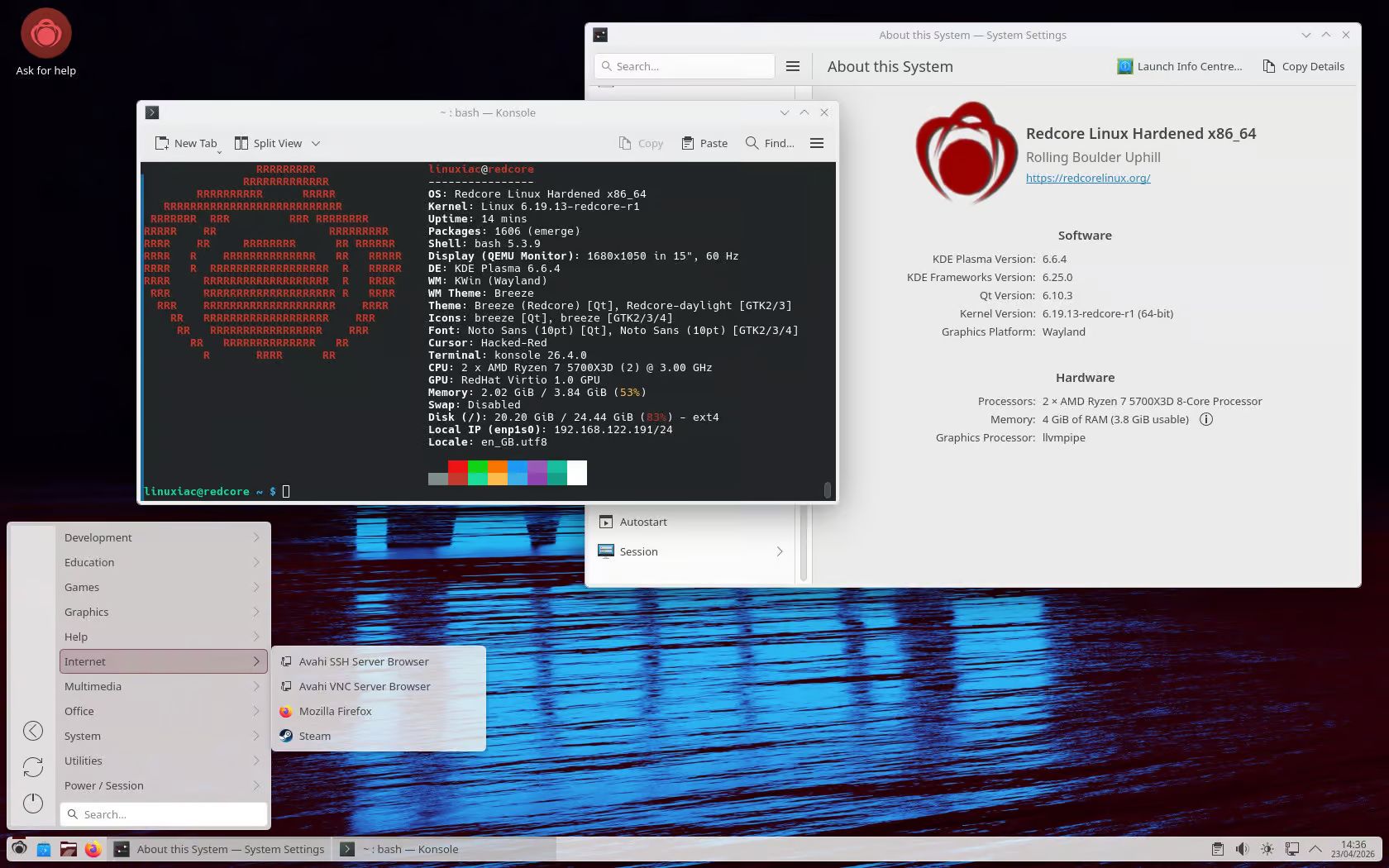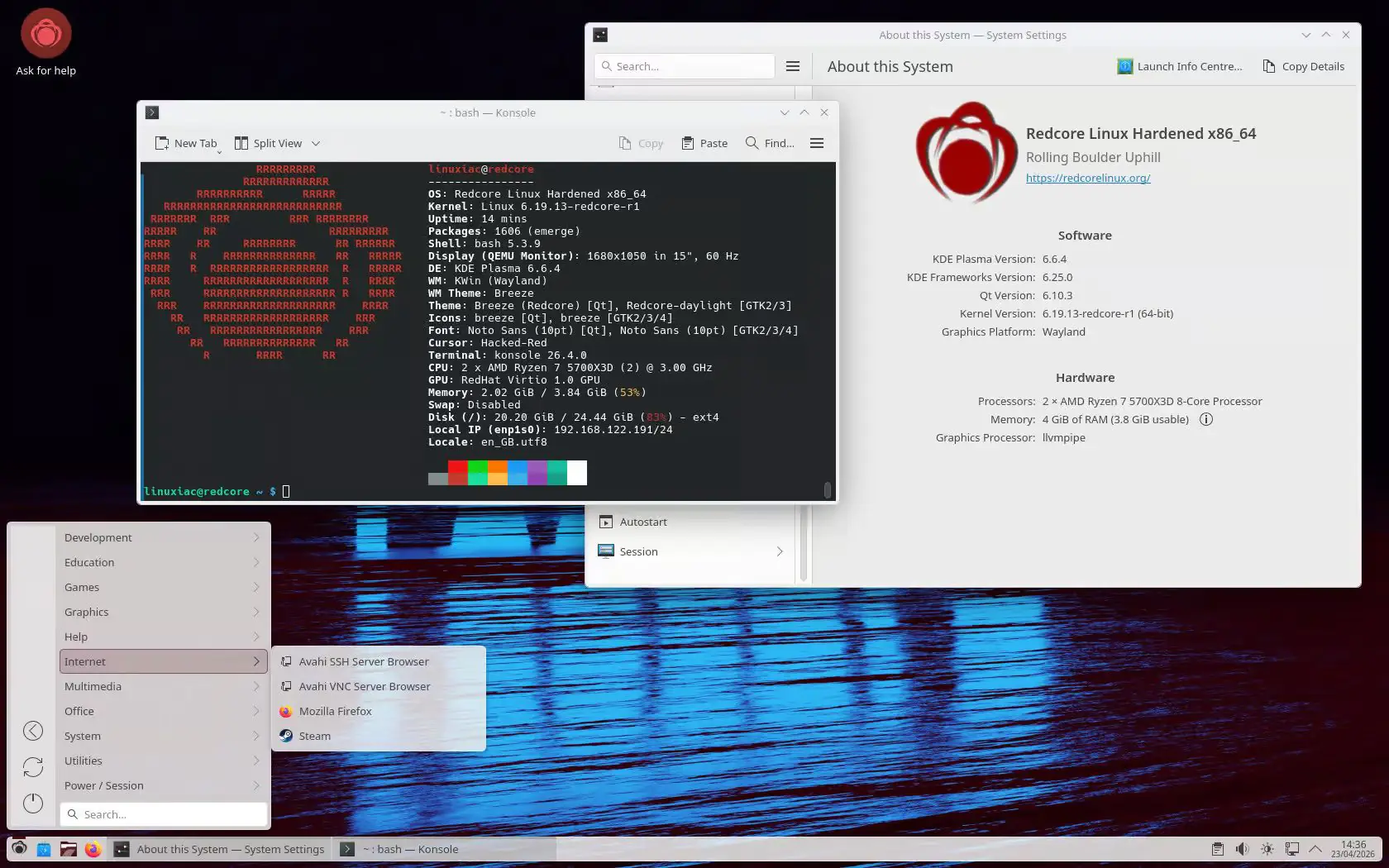 Что касается рабочего стола, дистрибутив поставляется с Plasma 6.6.4 и коллекцией приложений KDE Gear 26.04. В то время как в Gentoo убрали встроенную интеграцию приложений Qt5 с KDE Plasma 6, Redcore по умолчанию поддерживает настройку на основе qt5ct, чтобы обеспечить единообразную тему оформления для приложений Qt5.