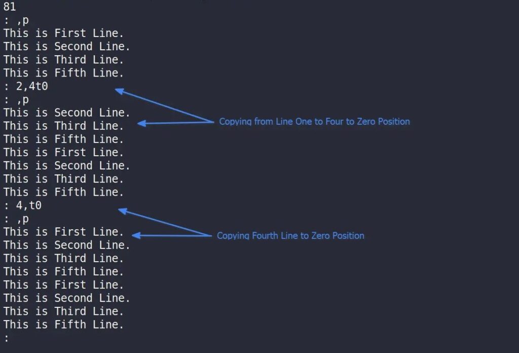 15. Вместо дублирования вы можете переместить строку из одного места в другое, используя метод, очень похожий на предыдущий. Просто замените «t» на «m» в «<from>,<to>m<position>» или «<line-number>m<position>» в командном режиме.