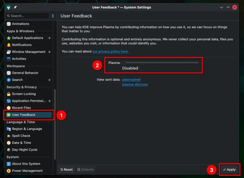 Откройте системные настройки KDE. На левой боковой панели перейдите в раздел Безопасность и конфиденциальность и выберите Отзывы пользователей. С помощью вертикального ползунка выберите один из четырёх уровней, определяющих, какой объём технических данных ваша система отправляет в проект KDE. Когда закончите, нажмите Применить, чтобы сохранить изменения.