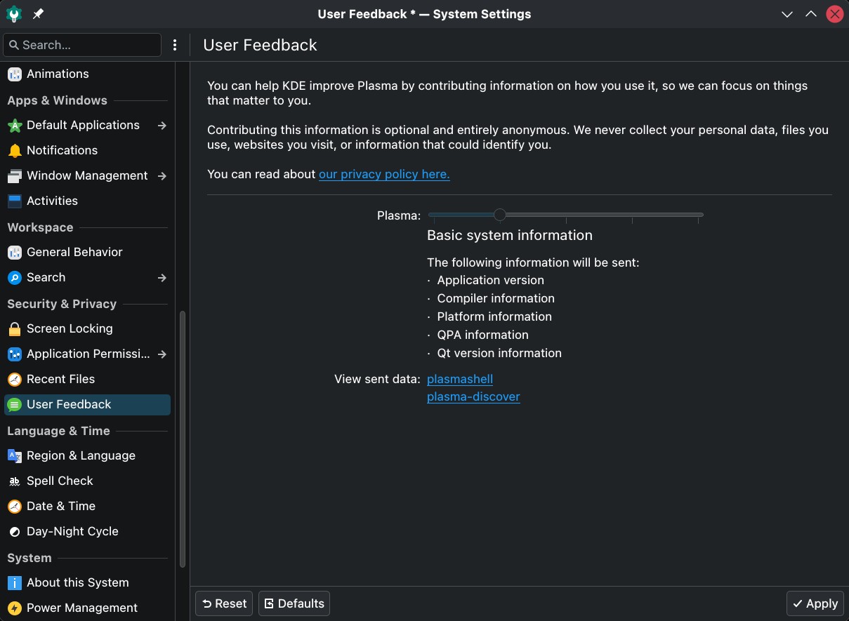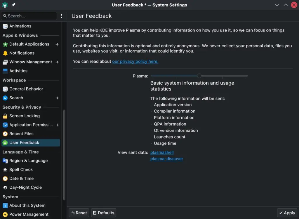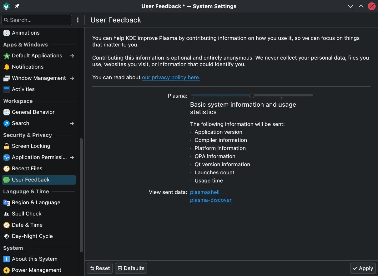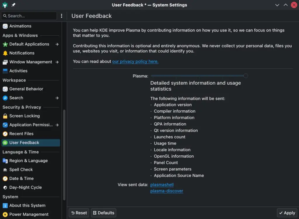 Эта функция доступна непосредственно в настройках системы в разделе Отзывы пользователей. Она отключена по умолчанию, и в ней чётко указано, какие данные будут передаваться на каждом уровне. Персональные данные не собираются, и KDE прямо заявляет, что файлы, веб-сайты или любая другая информация, которая может идентифицировать пользователя, никогда не передаются.