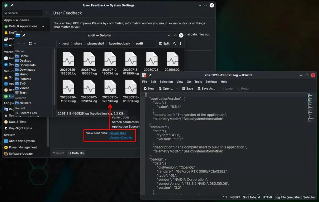 Однако, если у вас всё ещё есть сомнения, KDE поможет вам развеять их, позволив быстро просмотреть, какие именно данные отправляются. Нажмите на одну из двух ссылок, plasmashell или plasma-discover, и ваш файловый менеджер откроет каталог, содержащий сгенерированные файлы. Затем вы можете открыть эти файлы в текстовом редакторе и самостоятельно просмотреть их содержимое, чтобы успокоиться.