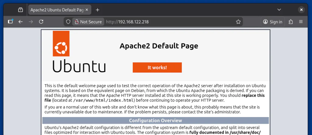 Вы также можете проверить веб-сервер Apache через веб-браузер, введя IP-адрес сервера по протоколу HTTP. В веб-браузере должна открыться веб-страница Apache по умолчанию, как на скриншоте ниже:
