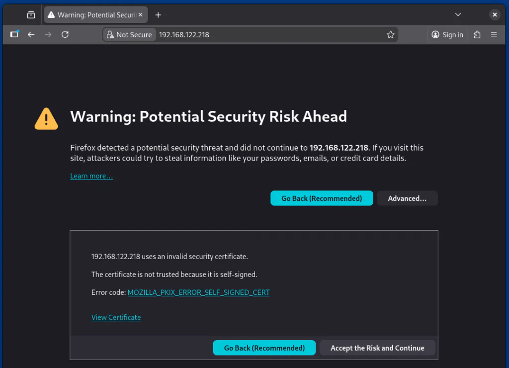 Вы увидите следующую страницу с ошибкой. Это связано с тем, что Apache настроен на работу с самоподписанным сертификатом. Просто примите это и продолжайте работу, чтобы обойти ошибку сертификата. Веб-страница должна отображаться безопасно.