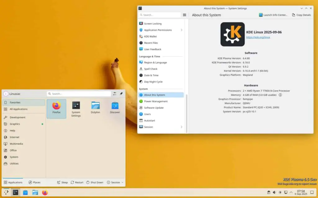 Проект KDE запустил новую инициативу по выпуску собственного дистрибутива для широкой публики. А сегодня был анонсирован первый альфа-релиз KDE Linux (кодовое название «Project Banana») — новой «эталонной реализации» операционной системы, созданной для демонстрации возможностей Plasma и полного набора приложений KDE.