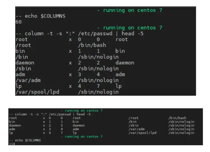 При изменении размера терминала column соответствующим образом корректируется его вывод. Сравните эти примеры с терминалами разной ширины:
