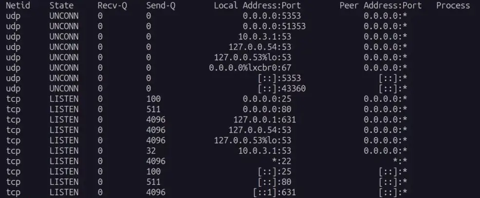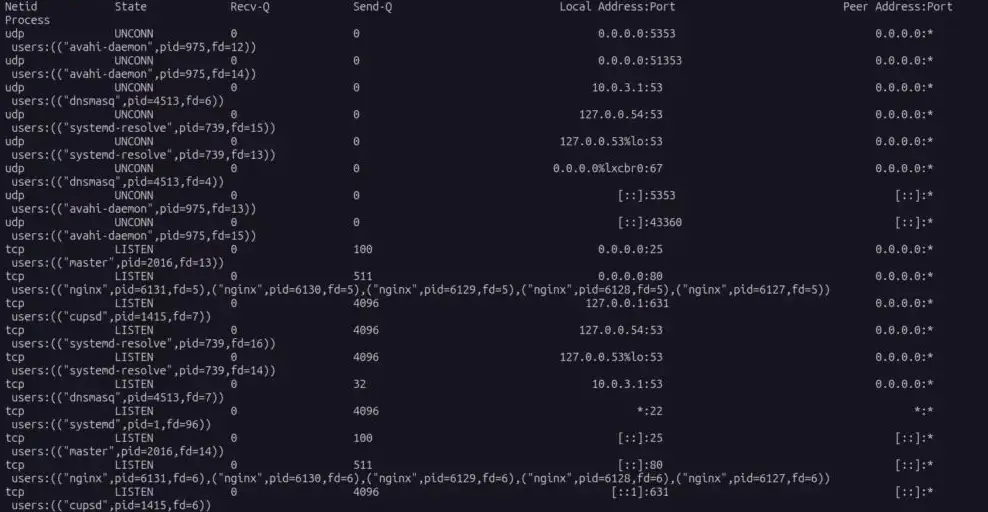 В приведенном выше списке перечислены все открытые порты вашей системы Linux. Вам нужно обратить внимание только на те порты, состояние которых обозначено как LISTEN.
