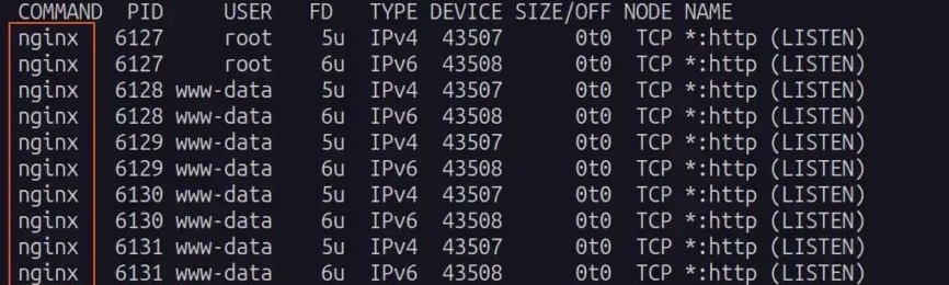 Кроме того, вы можете использовать команду lsof с опцией -i и номером порта, который вам нужен, чтобы просмотреть список всех фоновых служб, использующих этот порт.
