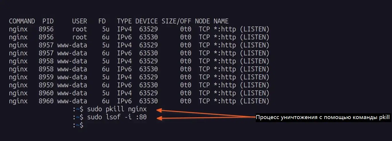 Кроме того, вы можете напрямую завершить работу всех служб или программ, отвечающих за управление этим конкретным портом, используя идентификатор или имя процесса с помощью команды pkill.
