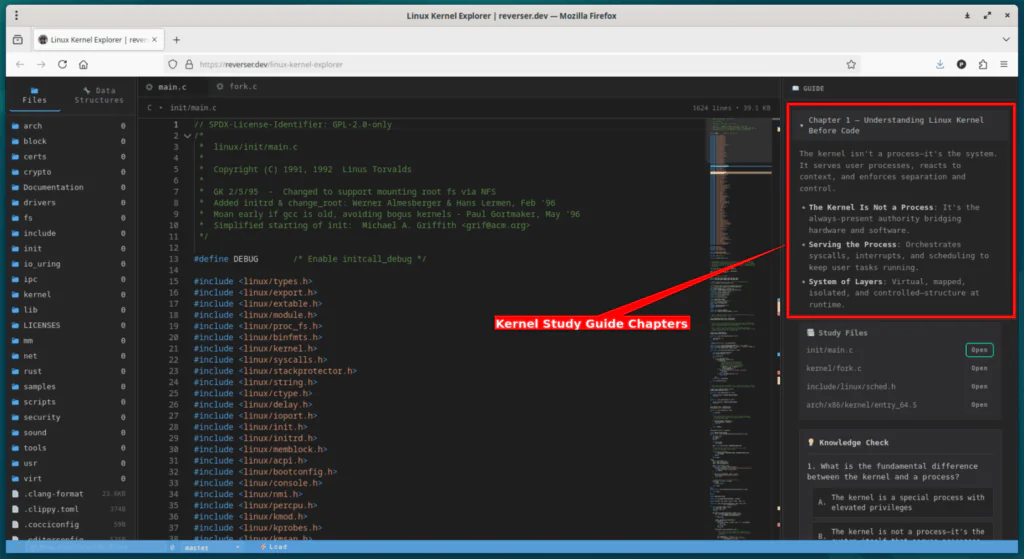 К счастью, сайт Linux Kernel Explorer предлагает гораздо более простой способ начать. Он превращает изучение ядра в понятный и удобный процесс. Сайт ведёт вас от главы к главе, помогая без труда понять, как работает ядро.