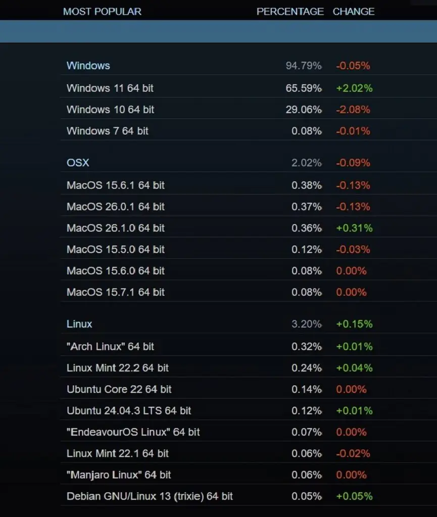 Одновременно с ростом числа пользователей Linux окончание поддержки Windows 10 привело к тому, что её доля упала до 29 %, поскольку геймеры перешли на Windows 11, на которую сейчас приходится 65 %. Это неудивительно, учитывая простоту обновления и широкую аппаратную и программную совместимость Windows 11. Тем не менее, похоже, что небольшая часть пользователей, отказавшихся от Windows 10, перешла на какой-нибудь дистрибутив Linux, отдав предпочтение Mint, Devian и Bazzite.