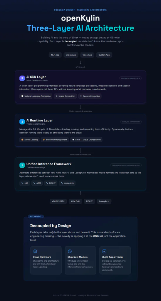 openKylin хочет это изменить. На саммите FOSSASIA 2026 в Бангкоке, Таиланд (8–10 марта), команда представила архитектуру, в которой искусственный интеллект не является приложением, работающим поверх операционной системы.