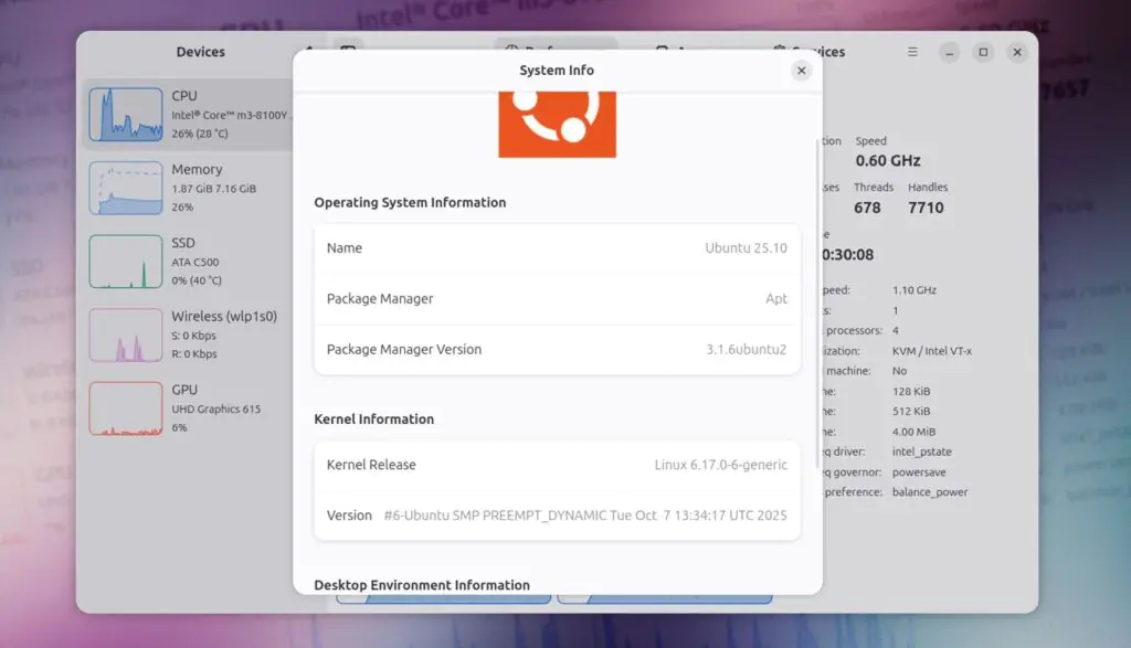 Чтобы не открывать другое приложение (или использовать Fastfetch в терминале), в Mission Center теперь есть диалоговое окно «О системе», в котором отображается информация о менеджере пакетов и его версии, номере и версии ядра, а также о среде рабочего стола.