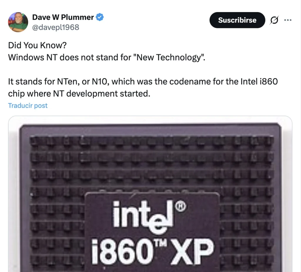 Как показал Пламмер в X, происхождение названия гораздо более техническое и менее напыщенное. «NT не означает новые технологии», — приговаривает инженер. Чтобы понять реальность, нужно отправиться в конец 80-х. Microsoft начала разрабатывать эту новую операционную систему не на процессорах x86, которые мы все знаем и используем до сих пор, а на чипе Intel RISC под названием i860. Кодовое название этого чипа во время его разработки было «N10» (или N-Ten).