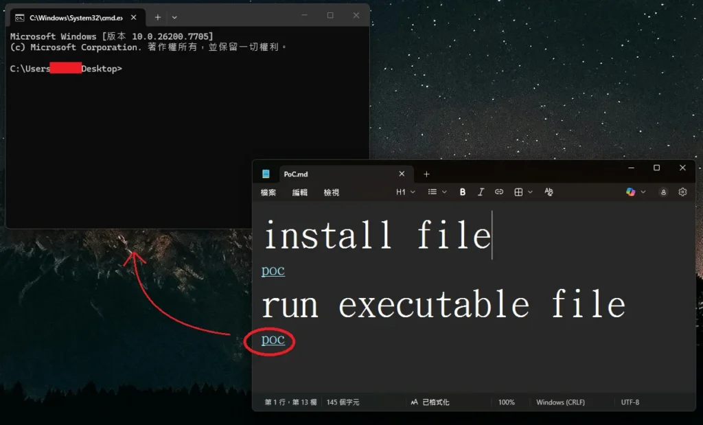 Если пользователь откроет этот файл Markdown в «Блокноте» Windows 11 версии 11.2510 или более ранней и откроет его в режиме Markdown, приведенный выше текст отобразится в виде кликабельной ссылки. Если нажать на ссылку, удерживая клавишу Ctrl, файл будет автоматически запущен без предупреждения со стороны Windows.