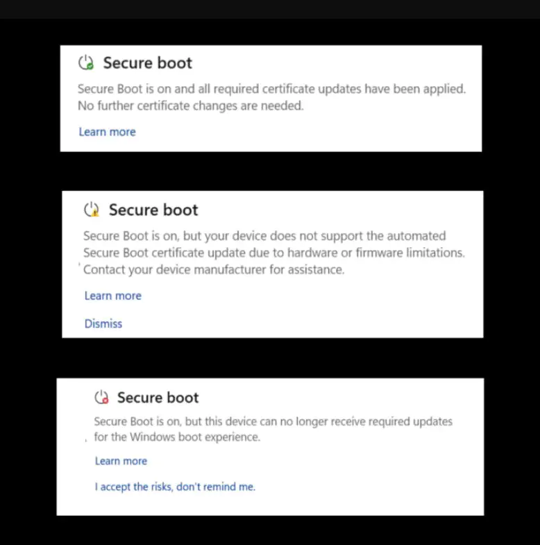 Третий, красный значок, указывает на то, что данный компьютер не может получить новые сертификаты безопасной загрузки. Как описывает Microsoft, этот статус появляется только после обнаружения уязвимости системы безопасности, влияющей на процесс загрузки, которую невозможно исправить на устройствах, которые еще не получили обновленные сертификаты. Это может произойти уже в июне 2026 года, когда истечет срок действия некоторых из текущих сертификатов безопасной загрузки.