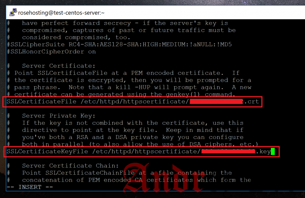 Измените пути по умолчанию с путями к файлу сертификата и файлу ключа соответственно, как показано здесь: