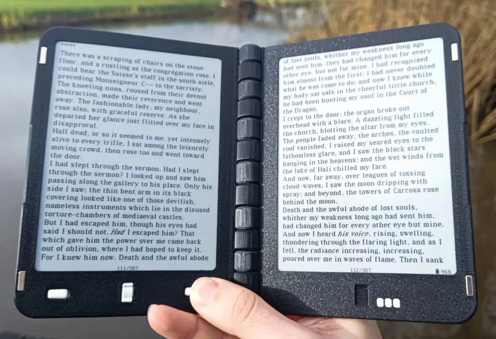 Что касается программного обеспечения, Diptyx работает на специальной прошивке, предназначенной для чтения файлов EPUB. Книги передаются через USB-C и хранятся локально на SD-карте объёмом 2 ГБ, которую можно заменить. В стандартной конфигурации нет DRM, не требуется учётная запись и подключение к интернету. Устройство загружается непосредственно в библиотеку пользователя или в последнюю открытую книгу, что позволяет сосредоточиться на чтении и не отвлекаться.
