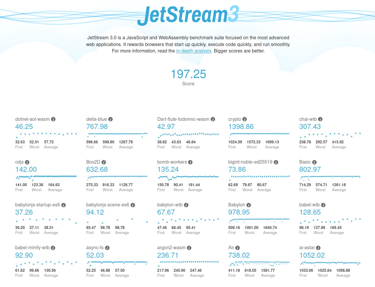 Наконец, мы хотим добавить, что, хотя такие тесты, как Speedometer, ориентированы на повседневную работу браузера, JetStream по-прежнему является наглядным показателем того, как браузерные движки справляются с ресурсоемкими веб-задачами, требующими больших вычислительных мощностей. Последняя версия — большой шаг вперед в этом направлении.