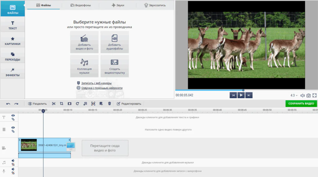 3. Откроется рабочее пространство. Кликните по кнопке «Добавить видео и фото», чтобы загрузить файл.