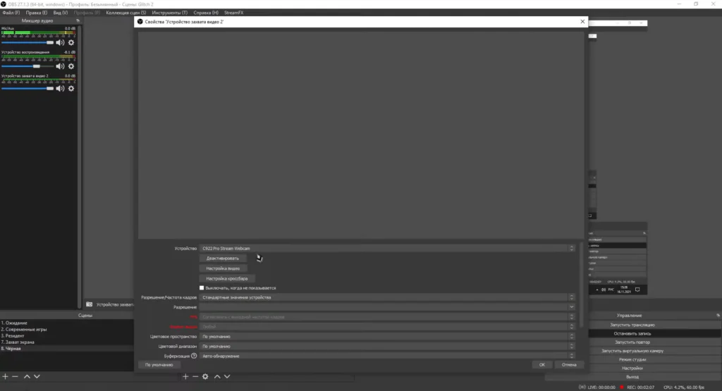 Однако высокий порог входа компенсируется возможностями. Например, здесь можно детально настраивать параметры: выбирать разрешение, частоту кадров, цветовое пространство, битрейт и кодек. Дополнительно через OBS удобно управлять источниками, переключаться между ними, добавлять поверх текст и графики.