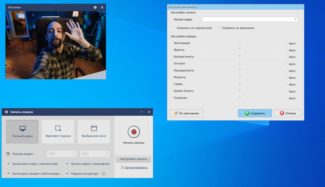 Экранная Студия — удобная программа для записи видео с веб-камеры, которая подходит для начинающих пользователей и для более опытных авторов. Поддерживает подключение внешних устройств для захвата звука и изображения, а еще пишет видео с монитора. Софт позволяет настраивать картинку, чтобы она оставалась качественной даже при слишком слабом или ярком освещении. Доступны параметры: экспозиция, яркость, контрастность и другие.