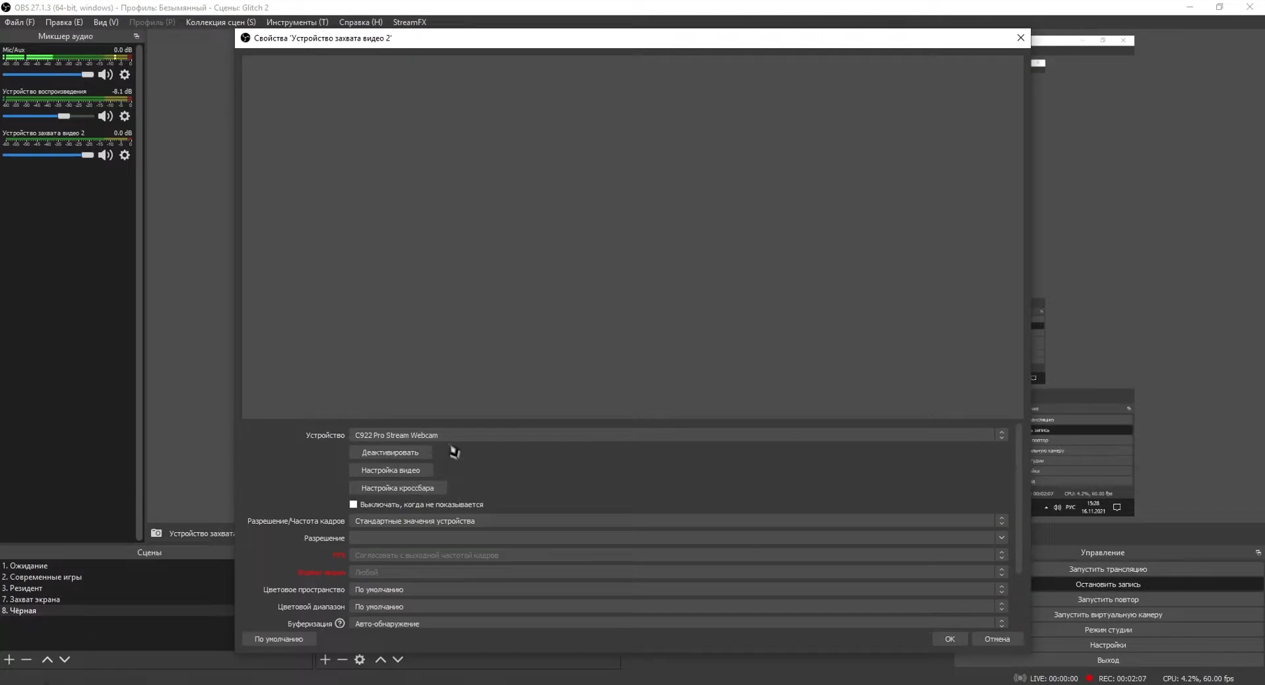 Однако высокий порог входа компенсируется возможностями. Например, здесь можно детально настраивать параметры: выбирать разрешение, частоту кадров, цветовое пространство, битрейт и кодек. Дополнительно через OBS удобно управлять источниками, переключаться между ними, добавлять поверх текст и графики.