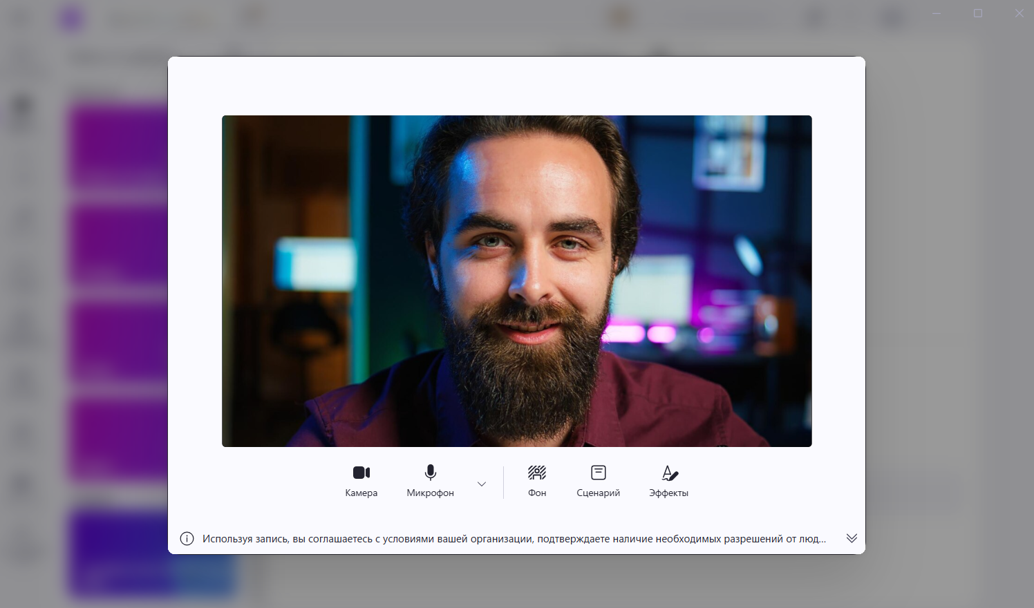 В программе реализована ИИ-функция размытия заднего фона за пользователем. Однако для корректной работы позади человека не должно быть движущихся объектов. Также ПО поддерживает удаление зеленого хромакея.