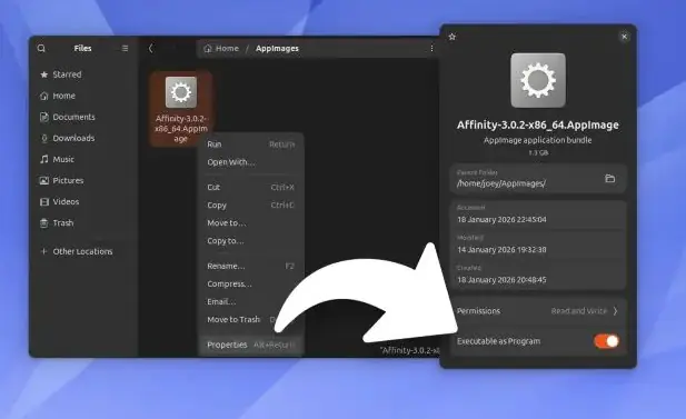 Используйте такой инструмент, как GearLever, чтобы создать программу запуска, связанную с Affinity AppImage. Так вам будет проще находить и открывать пакет вместе с другими установленными приложениями.