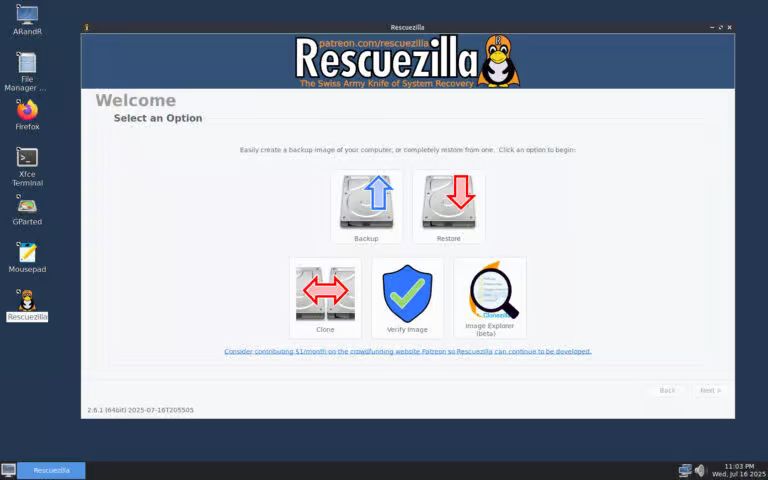 Image Explorer (по-прежнему помеченный как бета-версия) снова доступен после того, как был недоступен во время предыдущего точечного релиза. Firefox возвращается к сборке Ubuntu 24.10 благодаря переходу на официальные DEB-пакеты Mozilla, а не на доставку через snap, которая плохо сочеталась с системой сборки Rescuezilla на основе chroot.