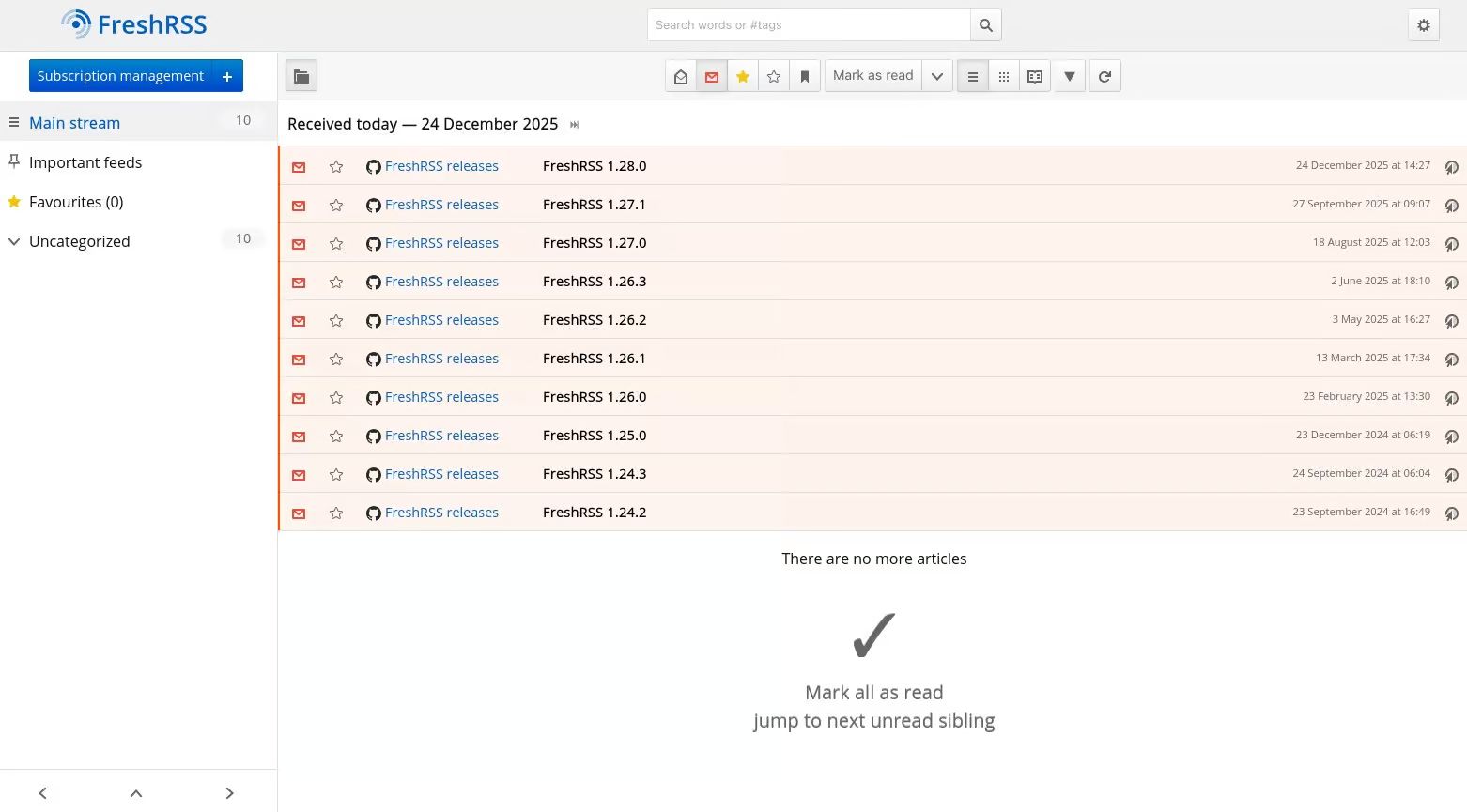 Кроме того, теперь пользователи могут отмечать статьи как прочитанные по возрасту при сортировке по дате публикации, а в пользовательском интерфейсе появились ссылки для перехода между группами статей и прямой навигации к следующему переходу. Кроме того, в FreshRSS 1.28 расширены возможности отображения ленты и добавлена функция обмена данными о видимости ленты через API.