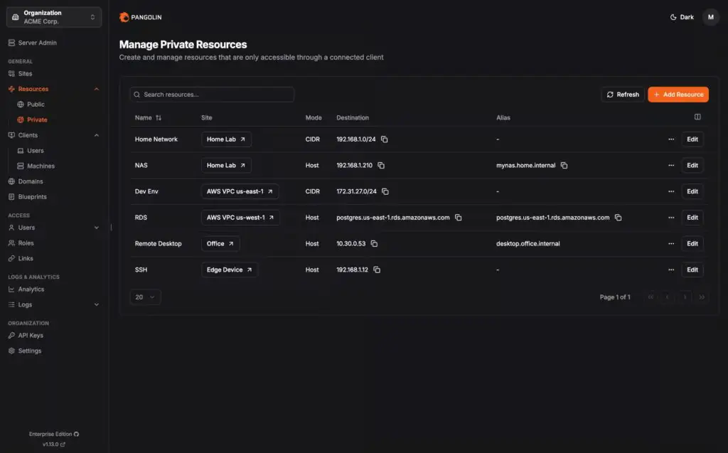 Главное изменение — новая функция «Частные ресурсы» Она заменяет старые функции «Клиентские ресурсы», «Прокси-ресурсы» и настройку подсетей на основе сайта. Частные ресурсы определяют, к чему можно получить доступ в сети, от одного хоста до целой подсети, с помощью CIDR.
