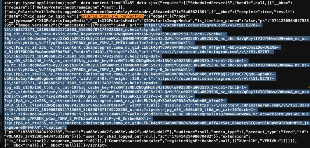 В примере Banga объект JSON polaris_timeline_connection, возвращённый в HTML, содержал закодированные ссылки CDN на фотографии, которые не должны были быть доступны.