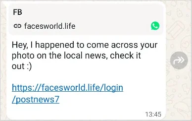 Атака начинается с короткого сообщения от знакомого человека, в котором он делится ссылкой, якобы ведущей на онлайн-фотографию жертвы. Чтобы вызвать доверие, ссылка отображается как предварительный просмотр контента в Facebook.