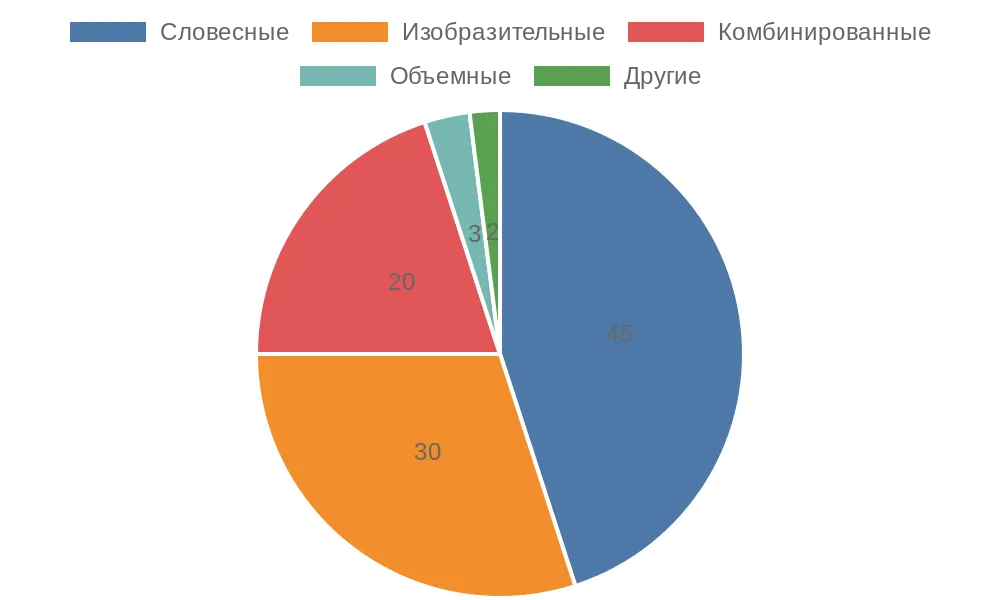 Для иллюстрации распределения заявок по типам ТЗ приведем диаграмму, основанную на статистике Роспатента. Она показывает, как словесные и изобразительные знаки доминируют в подачах через онлайн-сервисы.