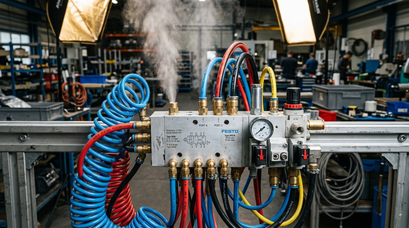 Лейсы (распределители) в работе: многопортовая распределительная панель на заводе обеспечивает поток воздуха к инструментам.