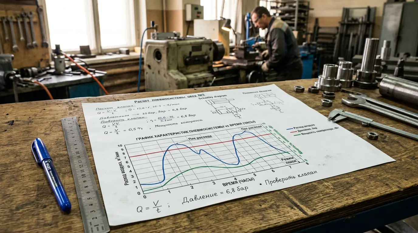 Диаграмма расхода: ось X — время смены, Y — л/мин. Норма: запас 20% на утечки. В российских условиях (морозы -30°C) добавьте обогрев магистрали — потери конденсата до 15% без него.